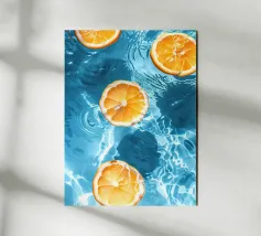 Un motivo grafico in stile pop art di fette d'arancia su uno sfondo blu scuro. La composizione è moderna, vibrante e rappresenta un design fresco, vivace ed elegante.