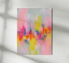Quest'opera d'arte astratta mostra superfici colorate che si fondono tra loro nei toni del rosa pastello, giallo, blu, verde e rosa. Le morbide pennellate e l'armoniosa composizione cromatica in stile pop art creano un'atmosfera vibrante e vivace. Il motivo appare moderno, leggero ed emozionante e invita a una libera interpretazione.