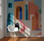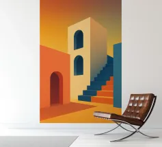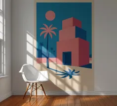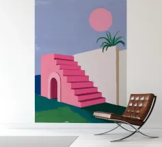 A surreal architectural composition of arches, stairs, and doorways in a soft pastel palette of pink, blue, and beige. A lone palm tree adds a touch of nature to this tranquil and dream like labyrinth.