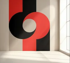 Un audace disegno astratto ispirato al Bauhaus, caratterizzato da cerchi rossi sovrapposti e ritmiche linee verticali nere. Un elemento d'arredo moderno e di grande impatto, perfetto per gli interni contemporanei.