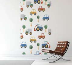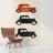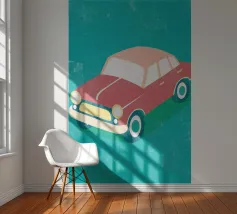 Das Bild zeigt drei stilisierte Retro-Autos, die farbenfroh und grafisch gestaltet sind. Jedes Auto hat ein einzigartiges Muster—von Punkten bis zu schlichten Farbflächen. Die kräftigen Farben und klaren Linien verleihen dem Bild eine spielerische und illustrative Ästhetik, die an moderne Pop-Art oder vereinfachte Grafikdesigns erinnert.
