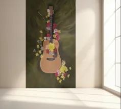 An acoustic guitar rests on a red chair beside a checkered floor, inviting stories in sound and solitude.