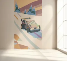 Illustrazione di un veicolo fuoristrada su una strada sterrata con uno stile geometrico moderno.
