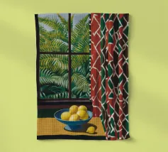 Una moderna composizione di natura morta con limoni gialli, una brocca e tre pesciolini su piatti, su uno sfondo di audaci motivi rossi, blu e a griglia.