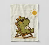 Un dinosauro rilassato con occhiali da sole che si gode il sole su una sedia a sdraio - un motivo estivo perfetto in un allegro stile cartoon per tutti coloro che amano il fascino preistorico con una sensazione di vacanza.Divertente dinosauro con occhiali da sole su una sedia a sdraio Stile amichevole dei cartoni animati con un'atmosfera estiva Ideale per gli amanti dei dinosauri e dell'atmosfera rilassata Combinazione di colori caldi e design solare