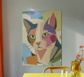 Raffigurazione artistica di un gatto in stile astratto con superfici colorate - giocosa, moderna e piena di espressività. Motivo del gatto in tecnica geometrica a blocchi di colore Colori armoniosi, caldi e vivaci Interpretazione contemporanea di un classico degli animali Ideale per gli amanti degli stili artistici moderni Espressivo, creativo e versatile