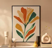 Audace silhouette floreale composta da forme ritagliate a strati nei colori arancio, salvia, verde scuro e beige. Ispirata agli iconici collage di carta di Matisse, questa composizione floreale astratta fonde la simmetria organica con il calore della metà del secolo scorso. Curve morbide, superfici piatte e una tavolozza terrosa creano un equilibrio visivo e un movimento sottile. Un pezzo minimalista ma espressivo che dona un tocco moderno e senza tempo a qualsiasi interno.