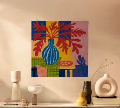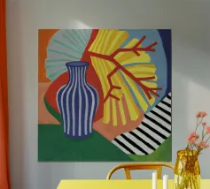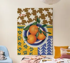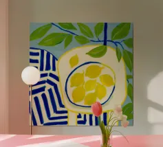 Una natura morta di limoni in una ciotola blu appoggiata su un ricco panno viola. Dietro, un alto vaso giallo con rami bianchi si staglia su uno sfondo arancione fuoco, creando una scena ad alto contrasto e ricca di colori.