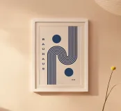 Un esempio straordinario di design grafico Bauhaus del primo periodo del 1919. Questo manifesto minimalista raggiunge il massimo impatto attraverso una geometria semplice ed elegante. Il disegno è caratterizzato da audaci linee parallele di colore blu intenso che confluiscono in una ritmica curva a S o forma di onda, bilanciata da due solidi cerchi blu. Questa composizione ad alto contrasto incarna l'attenzione del Costruttivismo per la struttura lineare e il movimento, rendendola un pezzo di grande effetto senza tempo. È perfetto per aggiungere un ritmo modernista a uno spazio minimalista, scandi o mid century modern. Il testo recita "BAUHAUS 1919". Questo è un file di riproduzione d'arte digitale di alta qualità,