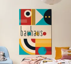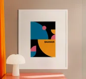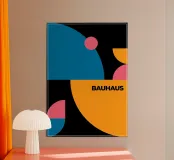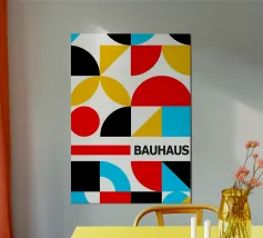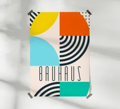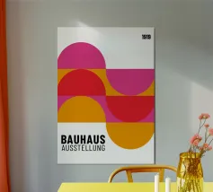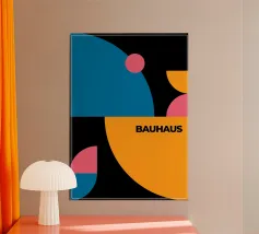 Un poster astratto audace e vibrante che presenta una composizione dinamica e sovrapposta di forme geometriche su un sorprendente sfondo nero. La tavolozza dei colori è caratterizzata da blu elettrico, rosa caldo e arancione brillante, che creano un elevato contrasto e un'energia visiva. Grandi semicerchi e archi dominano la cornice, con dettagli circolari più piccoli che aggiungono punti focali. La parola "BAUHAUS" è ben centrata nella metà inferiore, in caratteri puliti e sans-serif. Quest'opera d'arte è un'interpretazione moderna dell'astrazione geometrica e dei principi del design modernista. Il formato digitale ad alta risoluzione (7000x5000 pixel,