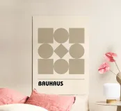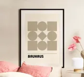 Immergetevi nei principi fondamentali del design moderno con questa straordinaria stampa d'arte ispirata al Bauhaus. L'opera d'arte presenta una griglia precisa di forme geometriche minimaliste - quadrati, cerchi e un diamante centrale - rese in una sofisticata tonalità beige terra. Questo disegno incarna perfettamente la semplicità astratta e la bellezza funzionale che hanno definito l'iconico movimento Bauhaus, fondato nel 1919. Prodotta con un'impressionante risoluzione di 7000x5000 pixel e 300 dpi, questa arte digitale di alta qualità assicura che ogni linea nitida e ogni sfumatura sottile siano rese con eccezionale precisione, rendendola un id