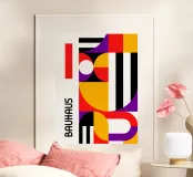 Uno straordinario poster astratto a orientamento verticale che incarna appieno il vocabolario visivo del movimento Bauhaus. La composizione è una disposizione dinamica di audaci forme geometriche, tra cui archi, quarti di cerchio e strisce, utilizzando una tavolozza ad alto contrasto di rosso, giallo, viola, nero e bianco. Il disegno crea un volto o una figura astratta complessa e interconnessa. La parola "BAUHAUS" è posizionata verticalmente lungo il bordo sinistro. Questa arte digitale di alta qualità (7000x5000 pixel, 300 dpi) garantisce colori vivaci e dettagli nitidi, rendendola un'eccellente opera d'arte moderna e grafica.
