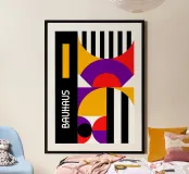 Un manifesto di ispirazione Bauhaus di grande impatto e massimalista, che presenta una fitta disposizione di forme geometriche primarie e secondarie. Il disegno presenta un audace contrasto di blocchi di colore solido - rosso vivo, giallo oro, viola intenso e nero - intervallati da strisce verticali bianche e nere ad alto contrasto. La composizione comprende semicerchi e quadranti, creando un motivo dinamico e interconnesso. Una banda nera piena sulla sinistra evidenzia il testo "BAUHAUS". Questo file di poster digitale (7000x5000 pixel, 300 dpi) offre dettagli eccezionali e colori saturi per una dichiarazione modernista di alto livello.