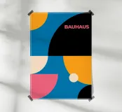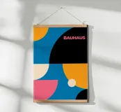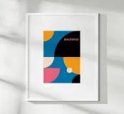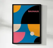 Un poster astratto di grande impatto visivo che celebra l'estetica Bauhaus con una tavolozza vibrante e moderna. La composizione è dominata da grandi forme circolari e semicircolari sovrapposte in colori saturi: blu elettrico, arancio brillante, rosa caldo e nero. Queste forme creano uno spazio negativo intricato e dinamico su uno sfondo chiaro. La parola "BAUHAUS" è posta in evidenza in rosa caldo nella sezione nera in alto a destra. Quest'opera d'arte è una pura espressione dell'astrazione geometrica e dei principi modernisti. Il formato digitale ad alta risoluzione (7000x5000 pixel, 300 dpi) garantisce una resa eccezionale.
