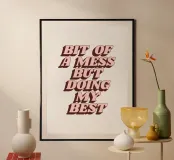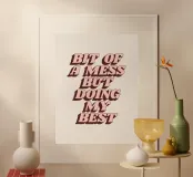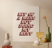 Ravvivate il vostro spazio con questa giocosa stampa d'arte che riporta la scritta "Bit of a Mess but Doing My Best" in allegre lettere retro 3D rosa e pesca su un morbido sfondo beige chiaro. Perfetto per tutti coloro che abbracciano gli alti e bassi della vita, questo disegno aggiunge calore, umorismo e una dose di positività a qualsiasi ambiente. Ideale come regalo per amici, studenti o colleghi, è un promemoria quotidiano per andare avanti. Con questo pezzo elegante e incoraggiante, potrete dare un tocco di fascino vintage e di incoraggiamento alla parete della vostra galleria, all'ufficio di casa o alla camera da letto.