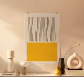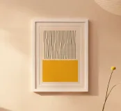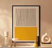 Un poster astratto equilibrato e minimalista che utilizza una forte divisione ed elementi contrastanti. La metà inferiore è un blocco solido e deciso di un ricco giallo senape. La metà superiore, su uno sfondo color crema, è caratterizzata da un motivo ripetuto di sottili linee verticali nere, volutamente irregolari, disegnate a mano, che si fermano al di sotto del blocco giallo. Questo disegno contrappone elegantemente una forma geometrica pulita a un motivo organico e libero, incarnando i principi estetici dell'arte moderna di metà secolo e di ispirazione Bauhaus. Questo download digitale di alta qualità (7000x5000 pixel, 300 dpi) garantisce un'immagine nitida e moderna.