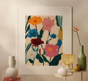 Un dipinto floreale giocoso con colori audaci e pennellate morbide, che celebra la bellezza della natura.