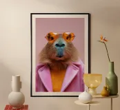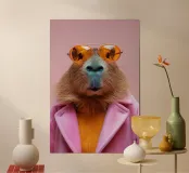 Un ritratto unico e spiritoso di un capibara vestito con un vivace cappotto rosa e un maglione giallo senape, sormontato da audaci occhiali da sole arancioni. Quest'opera d'arte unisce l'estetica della moda alla giocosità, portando un sorriso e una dose di fiducia in se stessi in qualsiasi spazio. Perfetta per gli interni moderni che cercano un'arte con personalità, colore e attitudine.