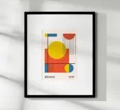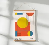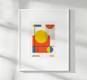 Un poster digitale dinamico e classico che celebra la fondazione del Bauhaus nel 1919. La composizione presenta una disposizione asimmetrica di grandi forme geometriche - cerchi e rettangoli - nell'iconica tavolozza di colori di ispirazione primaria: rosso-arancio, blu e giallo. Le spesse linee nere impongono una struttura chiara, mentre le sottili linee verticali e orizzontali aggiungono profondità e consistenza alle sezioni del disegno. Questo pezzo è un potente esempio di arte modernista minimalista e di ispirazione De Stijl. Questo download digitale di alta qualità vanta 7000x5000 pixel a 300 dpi, garantendo una chiarezza eccezionale e una qualità di stampa superiore.