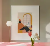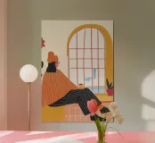 Questa illustrazione grafica di grande impatto cattura un accogliente momento di contemplazione al sole. Una figura stilizzata con un berretto arancione, un fluente poncho a righe e pantaloni neri a fantasia siede accanto a una grande finestra ad arco, gustando una tazza di caffè giallo. La finestra, incorniciata in giallo, si affaccia su una serena scena blu. Il vivace mix di motivi arancioni, neri e rosa incarna la giocosa estetica Dopamine Decor e Mid-Century Modern. Questo pezzo è una celebrazione unica del colore e del lusso tranquillo. Provate l'eccellenza dell'arte digitale di alta qualità. Questo download viene fornito con una risoluzione superiore