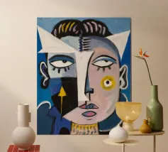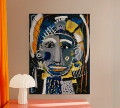 Questa opera d'arte presenta un personaggio astratto dinamico con linee decise e un mix di colori rosso, blu e bianco. Lo sfondo è pieno di forme e motivi astratti, che contribuiscono al tema dinamico generale.