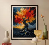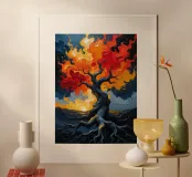 Questo affascinante dipinto a olio presenta una drammatica interpretazione astratta di un albero inghiottito da fiamme vibranti. La ricca tecnica di impasto crea un incredibile senso di consistenza e movimento, con spesse pennellate di arancioni, rossi e gialli infuocati che formano la chioma incandescente dell'albero. Il tronco e le radici scure e nodose ancorano l'inferno a un cielo cupo e tempestoso, reso con blu profondi, grigi e accenni di un minaccioso bagliore arancione all'orizzonte. Questo pezzo evoca potenti emozioni di passione, distruzione e resilienza, rendendolo un'aggiunta davvero unica e sorprendente a qualsiasi collezione d'arte.