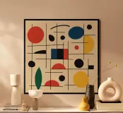Un insieme di forme colorate, in particolare cerchi e linee, crea una composizione dinamica. L'uso di colori primari aggiunge un'atmosfera vibrante e moderna.