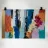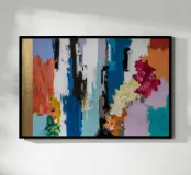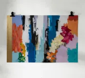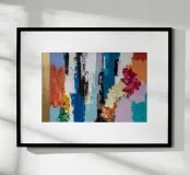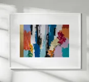Una composizione astratta con tratti verticali dominanti di blu, arancione e rosso, accentuati dal bianco e da scintillanti glitter dorati, che creano un senso di flusso dinamico verso il basso.