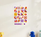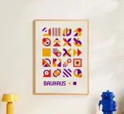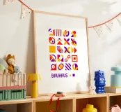 Un poster vibrante e giocoso di ispirazione Bauhaus con una griglia di venti distinti simboli geometrici astratti. Ogni motivo quadrato è costruito da combinazioni di triangoli, cerchi e linee in una tavolozza audace e accattivante di viola intenso, rosso vivo e giallo oro brillante. Il design mette in mostra la modularità e la bellezza funzionale dei principi grafici modernisti. Questo file poster digitale di qualità superiore (7000x5000 pixel, 300 dpi) garantisce linee nitide e colori ricchi e saturi, rendendolo un pezzo unico e di qualità.
