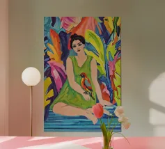 Marta ha portato una ciambella gialla nell'oceano e l'ha dichiarata nazione sovrana. Per tre ore beate ha governato con occhiali da sole oversize e un costume da bagno a righe che aveva visto più festival estivi di una pop star in pensione. Nessuna persona, nessun rumore, solo gabbiani educati e un'eccellente galleggiabilità. Quadro originale di una donna solitaria che galleggia su una ciambella giallo brillante in un mare vasto, calmo e verde acqua. Il costume da bagno a righe vintage, l'ampio cappello da sole e gli occhiali da sole rotondi conferiscono alla donna un'atmosfera retro e giocosa, mentre l'abbondante spazio negativo e la texture morbida creano una composizione calma e ariosa.