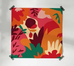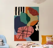 Un pezzo astratto, lunatico e sofisticato, che combina forme organiche e linee grafiche decise. La tavolozza di colori, composta da blu profondo, rosa arrossato e nero, crea un'estetica drammatica e contemporanea.