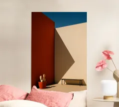 La luce soffusa del sole filtra da una finestra turchese, proiettando ombre sulle pareti arancioni. Un vaso d'argilla è appoggiato sul pavimento di legno, a sottolineare l'atmosfera artistica dello spazio.