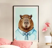 Un'illustrazione affascinante e sofisticata di un capibara vestito con una camicia blu e un papillon a fantasia.