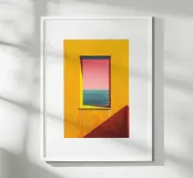 Una composizione minimalista ma vibrante, in cui un muro giallo brillante incornicia una serena vista sull'oceano sotto un cielo rosa sfumato. La geometria delle forme architettoniche contrasta con il morbido orizzonte naturale, fondendo calore e calma in una poetica fuga visiva. L'opera incarna l'armonia tra struttura e natura, evocando energia e tranquillità.