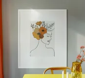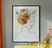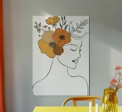 Un disegno al tratto minimalista raffigura il profilo di una donna dall'espressione serena. I suoi capelli sono ornati da grandi fiori stilizzati di colore arancione e giallo e da foglie delicate.