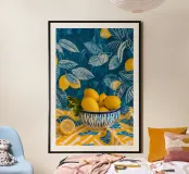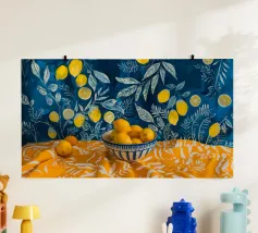 Guardate da vicino: Questa immagine è fotografia e pittura allo stesso tempo. Le tecniche di miscelazione digitale lo rendono possibile. L'effetto è sorprendente per l'osservatore. I limoni ricordano l'estate: il Mediterraneo, la Sicilia, la Toscana. Il profumo del sud si sente subito nell'aria. Questo ricordo di vacanza giallo-blu può essere utilizzato come still life sulla parete o su altri prodotti.