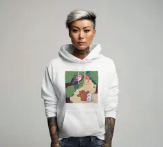 Questa opera d'arte raffigura una nuvola dall'aspetto scontroso con una bolla di pensiero contenente un uccello e un orso. La scena, umoristica e fantasiosa, è ambientata su un morbido sfondo blu.