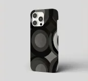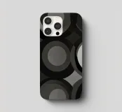 Una vivace serie di cerchi sovrapposti in diverse tonalità di grigio, nero e bianco crea un motivo visivo accattivante. Il disegno presenta toni contrastanti che aggiungono profondità.