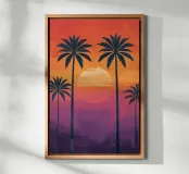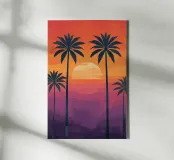 Questa splendida opera d'arte mostra le drammatiche sagome delle palme contro un cielo infuocato al tramonto. I toni arancione intenso e viola tenue si fondono perfettamente per creare una scena visivamente accattivante che incarna il calore e la serenità delle serate tropicali. Ideale per interni moderni, minimalisti o di ispirazione tropicale, questo pezzo aggiunge un tocco vibrante ma rilassante a qualsiasi spazio.