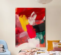 Un'audace esplorazione della struttura attraverso una vivida astrazione. Dominata da strati di cremisi, arancione e corallo, questa composizione dinamica intreccia forme geometriche con pennellate espressive, creando un'energia ritmica che sembra architettonica ma emotiva. Il gioco di angoli acuti e sfumature morbide evoca movimento, calore e vitalità: un pezzo forte per qualsiasi spazio moderno.