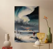 Immergetevi nella magia del Natale con questa splendida opera d'arte che raffigura Babbo Natale che cammina attraverso un paesaggio innevato verso un villaggio illuminato a festa. Il dipinto, ambientato sotto uno spettacolo mozzafiato di aurora boreale, cattura la serena bellezza dell'inverno e il fascino senza tempo delle festività natalizie. Realizzata nello stile di un classico paesaggio inglese, la composizione dettagliata riunisce la tranquillità della natura e il calore dello spirito natalizio. Perfetto per aggiungere un tocco magico al vostro arredamento natalizio o come regalo unico per gli amanti dell'arte e delle feste.