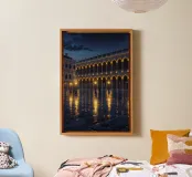 Questo dipinto iperrealistico mozzafiato ritrae la bellezza senza tempo di Venezia di notte, con archi luminosi, eleganti architetture rinascimentali e strade di ciottoli bagnate che riflettono luci dorate. La profondità dei dettagli delle finestre illuminate e delle intricate statue sui tetti esalta la grandezza di Piazza San Marco. Il cielo notturno blu scuro, disseminato di stelle, contrasta meravigliosamente con la luce calda, creando un'affascinante atmosfera da sogno. Ideale per gli amanti del fascino classico europeo, dell'eleganza storica e dei paesaggi urbani coinvolgenti.