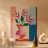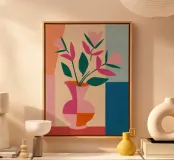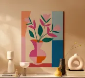 Illustrazione stilizzata di tulipani rosa in un vaso multicolore. Le forme astratte e l'armoniosa tavolozza di colori rosa, arancione e verde creano un pezzo floreale moderno e artistico.
