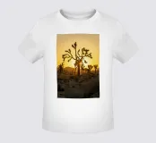 Alti alberi di Joshua si ergono dal terreno sabbioso, i loro rami contorti si protendono in tutte le direzioni come giganteschi candelabri. La terra secca è disseminata di rocce, arbusti resistenti e macchie di sabbia dorata. In lontananza, le basse montagne brillano nel calore. L'aria è calda e secca, pervasa dalla quiete del paesaggio aperto.