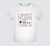 Un controller di gioco retrò è accompagnato dalla frase "Non invecchio, salgo di livello", utilizzando uno stile di carattere nostalgico. Questo design combina la cultura del gioco vintage con una visione umoristica dell'invecchiamento.