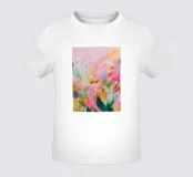 Il motivo mostra una composizione floreale dinamica e astratta, dai colori pastello decisi ma delicati. Pennellate di rosa, arancione e verde formano una moderna interpretazione di un prato fiorito estivo. La pittura conferisce all'opera profondità, leggerezza e un'aura naturale e vivace.