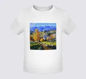 Un pittoresco paesaggio autunnale che raffigura un villaggio o una fattoria adagiata su una collina, circondata da un mosaico di alberi colorati nei toni dell'arancione e del giallo e da campi coltivati, con le lontane montagne blu a completare la scena.