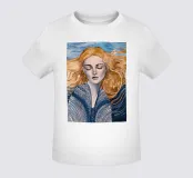 Un delicato ritratto di donna con fluenti capelli biondi o castano chiaro, con gli occhi chiusi o lo sguardo rivolto verso il basso, che indossa un abito blu e argento o bianco dai dettagli intricati che suggeriscono pizzi o armature.