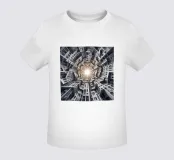 Una disposizione futuristica a spirale di edifici che convergono verso una fonte di luce radiante, creando un modello geometrico ipnotico e una profondità dinamica. I toni monocromatici esaltano l'estetica moderna e surreale.
