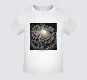 Questa immagine mostra una scena architettonica surreale con edifici concentrici disposti circolarmente. I toni monocromatici aggiungono un tocco vintage, mentre il centro illuminato dal sole crea profondità e un'illusione di altezza infinita.